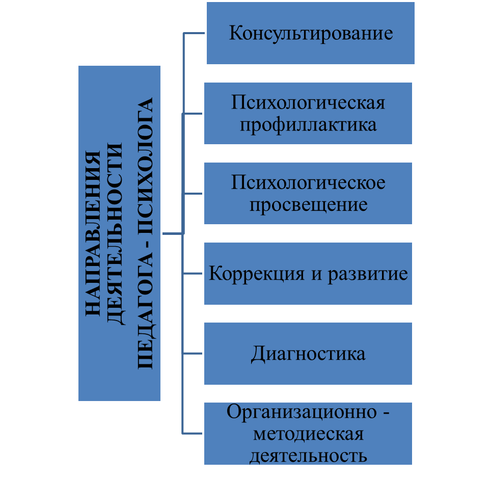 Все направления деятельности педагога психолога: — психопрофилактическая работа — психодиагностическая работа — коррекционно-развивающая работа — консультативная работа и психопросвещение — организационно-методическая работа Реализация этих направлений производится через различные виды деятельности и со всеми участниками образовательного процесса (дети, родитель, педагоги).
